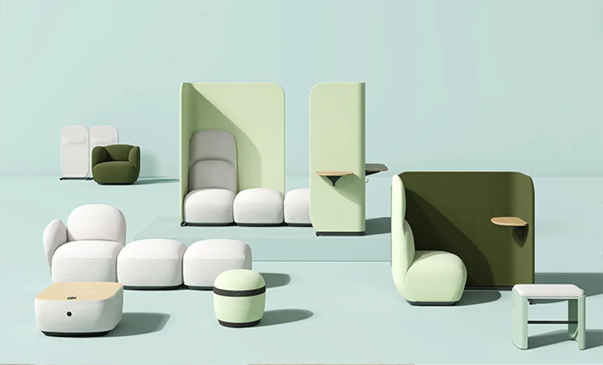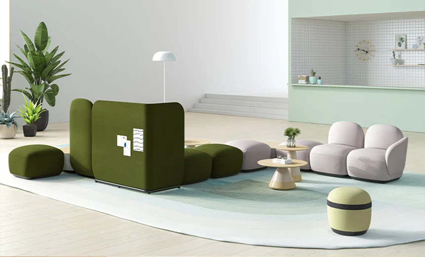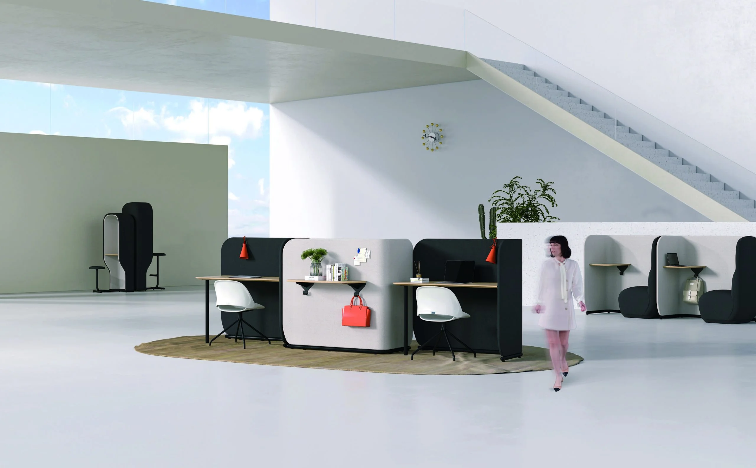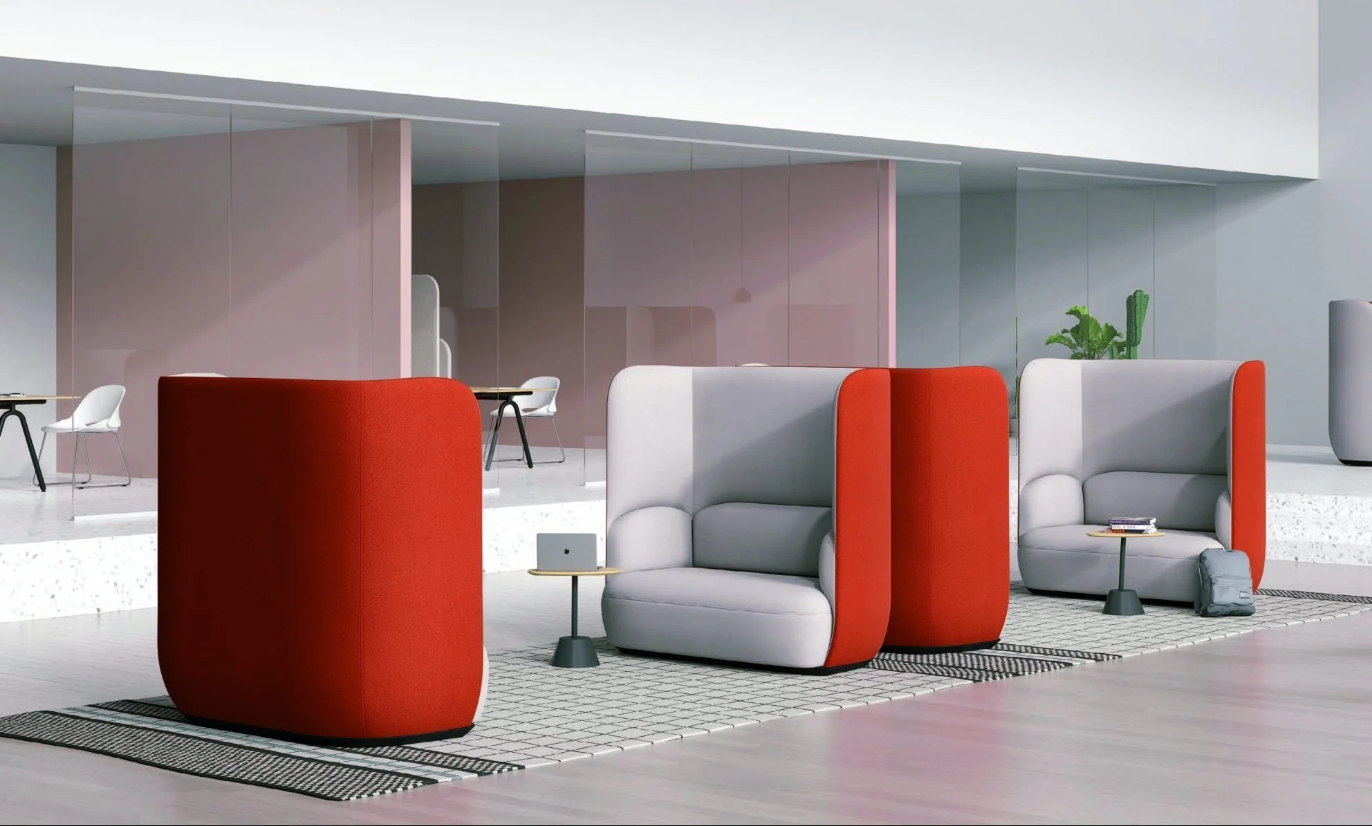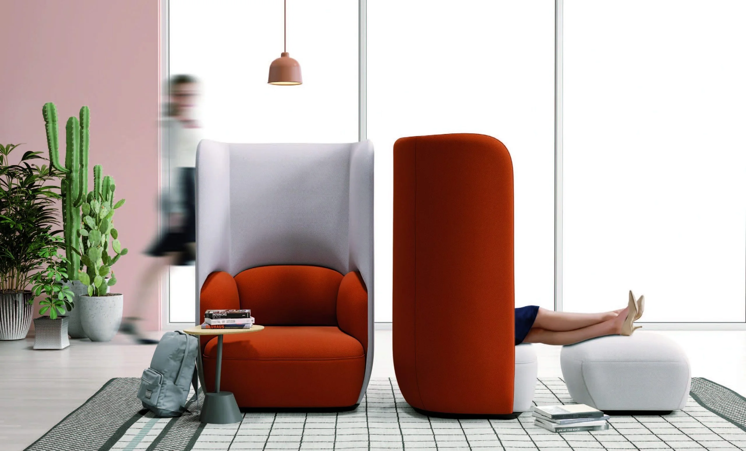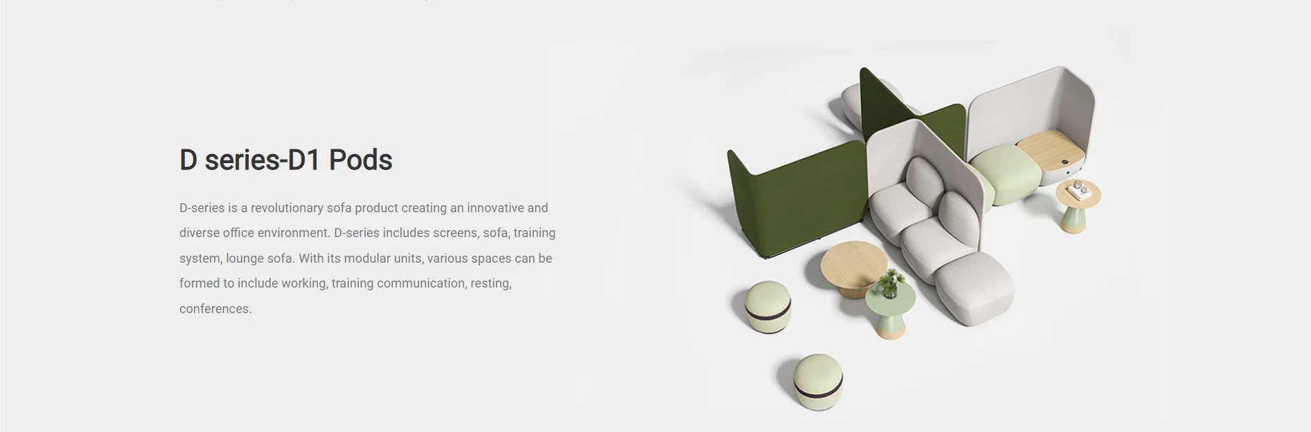 Be there when you need a time off. A leisure unit built with D series products: a single sofa with high backrest, a panel screen, and a matching table top. Relaxing/reading/working/resting here when users need a time alone would be a perfect choice.