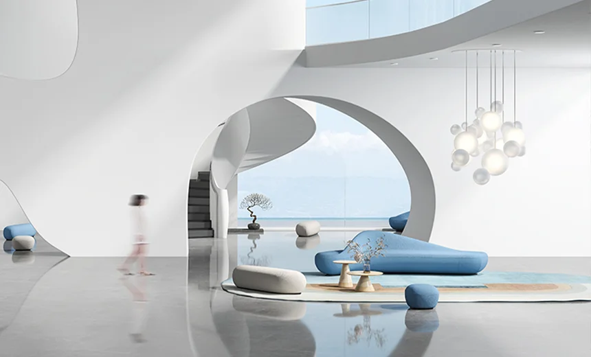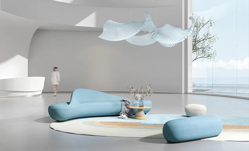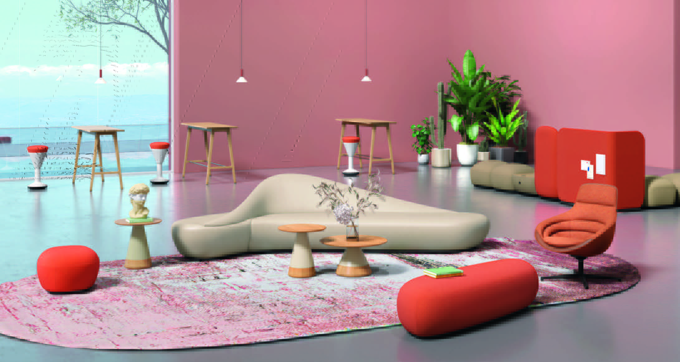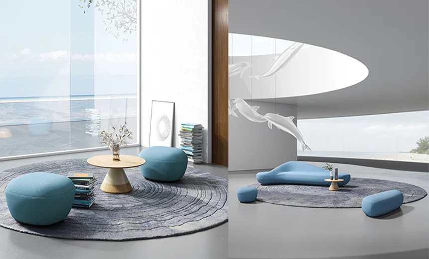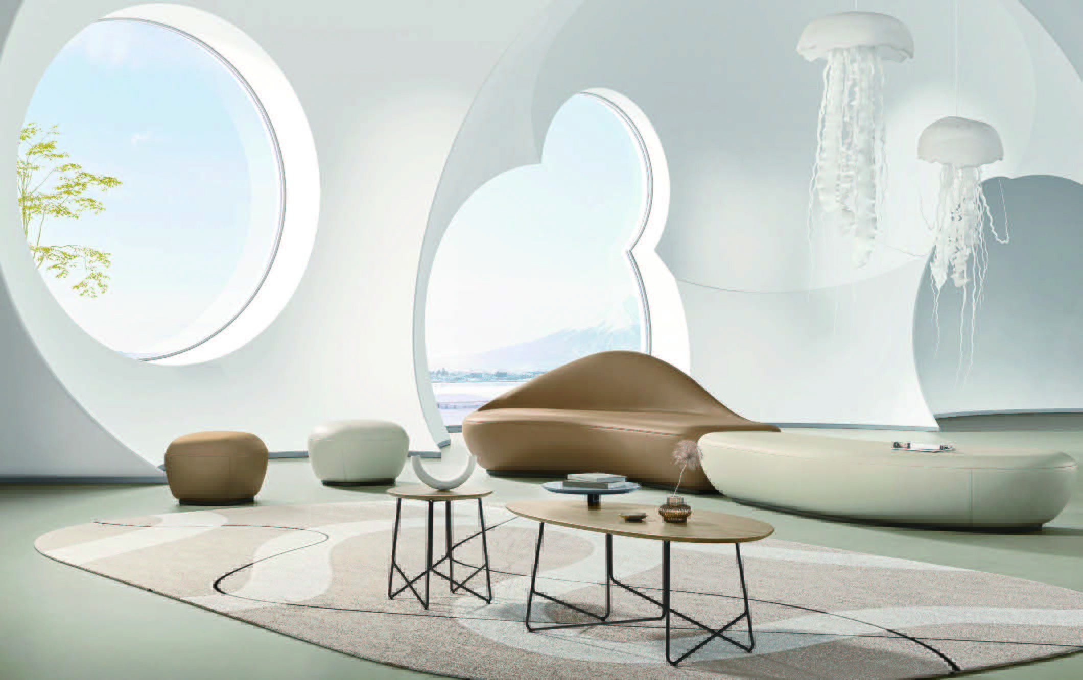 The designer draws inspiration from the beauty of island seascapes. Sinuous lines add an inviting character to the space. The D2 sofa ensures sufficient sitting space for relaxed gestures because seating is available on both sides, with a shared backrest to lean on.