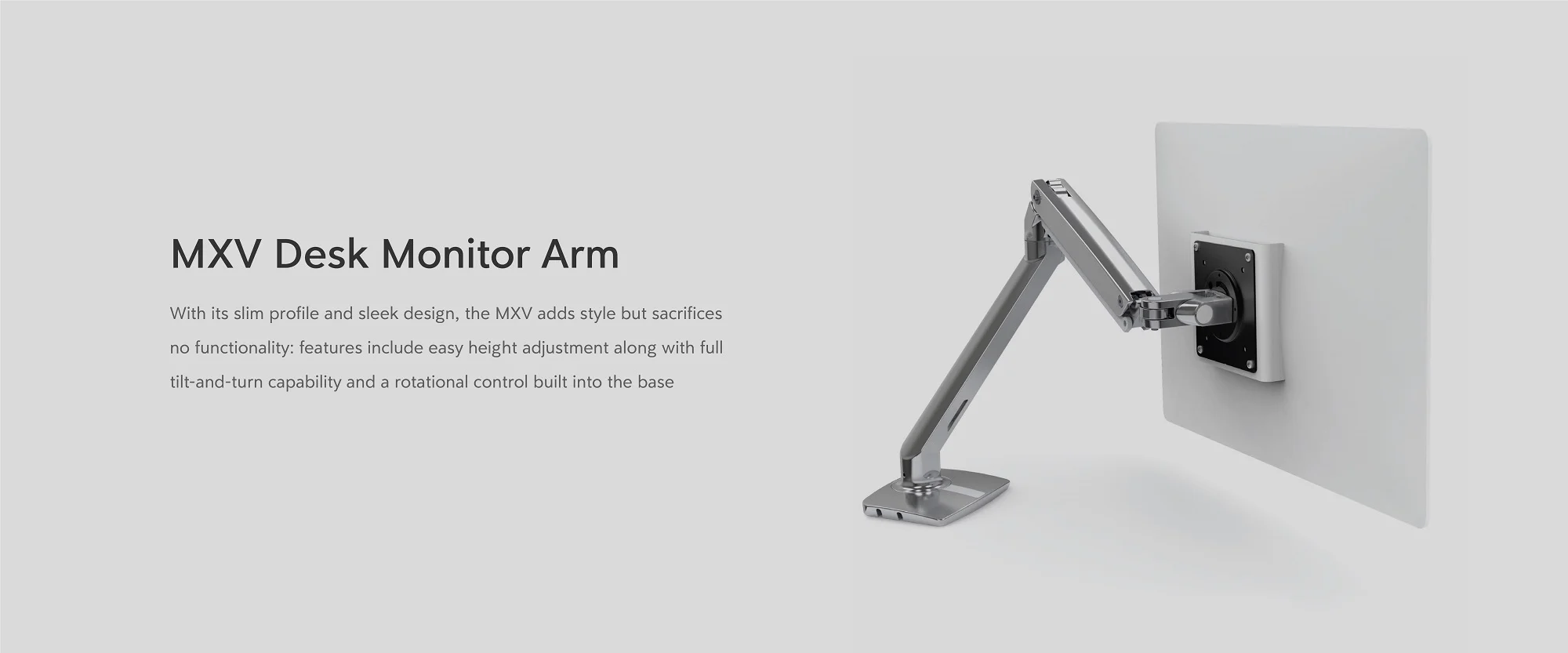 Style meets functionality with the MXV Desk Monitor Arm. Designed with a modern “V” shape, this sleek and lightweight arm keeps your screen stable as you adjust it for how you want to work. Slimmer than our LX family, the MVX fits in tight spaces and contains the cable chaos with thoughtful cable management.