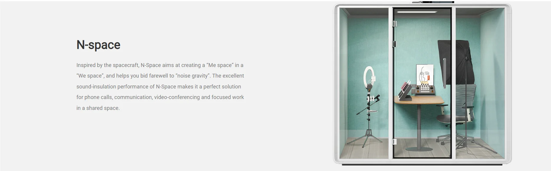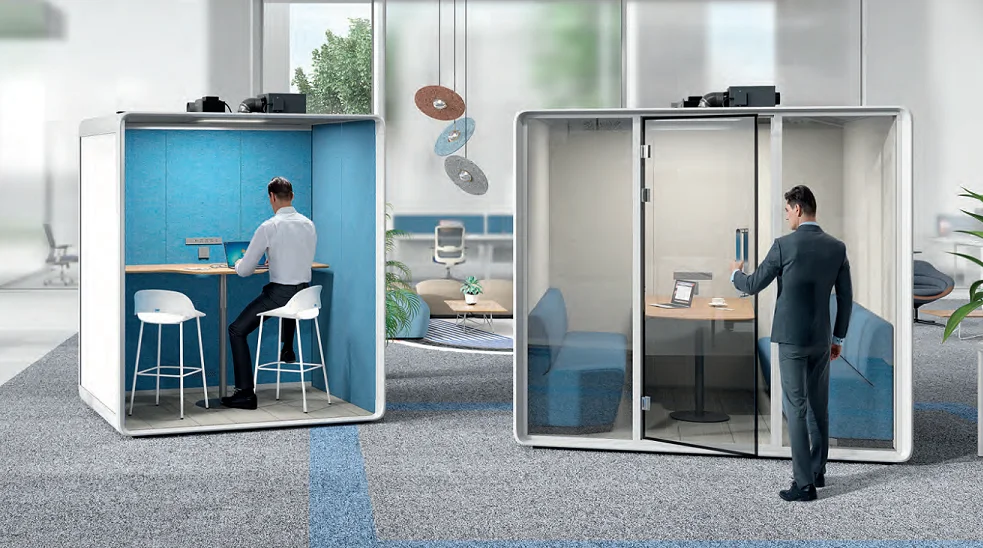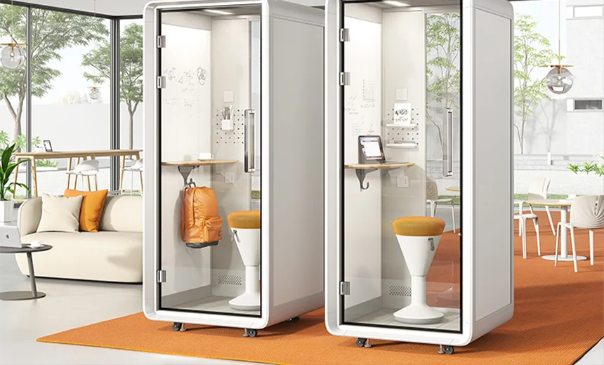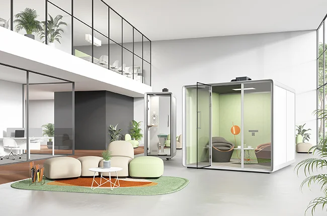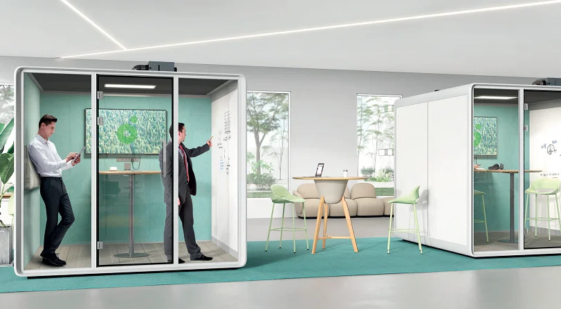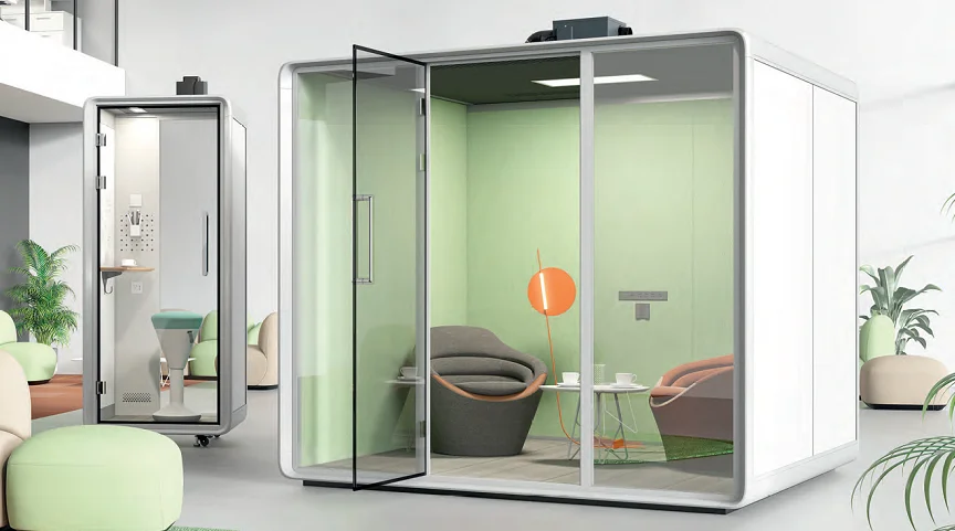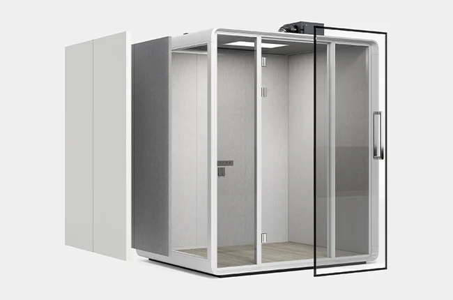 High-density sound-insulating felt on the wall and magnetic stripes on the frame block out every disturbance and minimize the noise every time you open and close the door. The 55 mm thick wall uses double-layer sound-reducing material, with the outer layer being a 10 mm double-layer panel and the inner layer a 45 mm honeycomb acoustic structure.