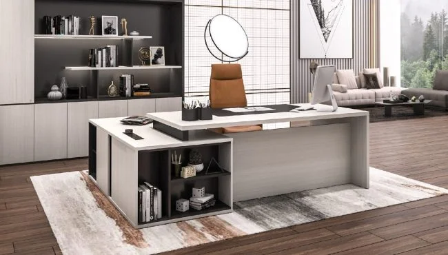 Masha white insert blends with black colour is placed on the right side of the main table structure including a set of drawer and open storage.