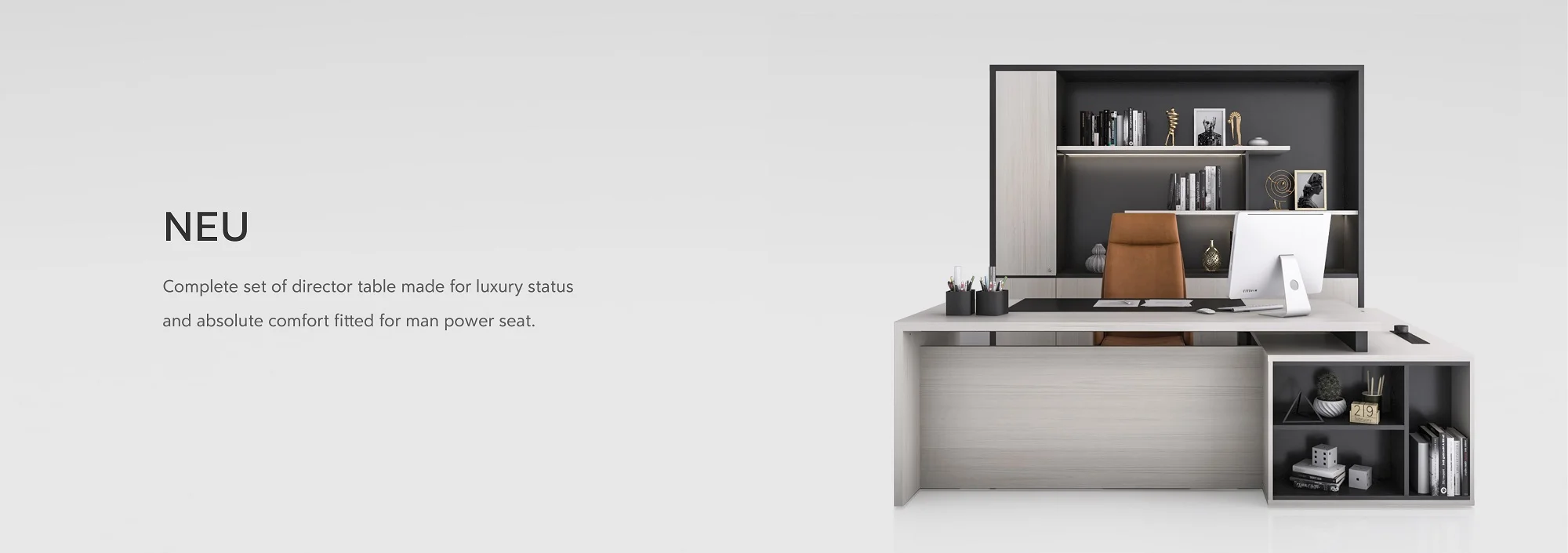 Inspired by a tribute to the leader, is designed to show leadership. The masculine desk commands respect. This series of director table with set back storage. Ideal for a top management environment.