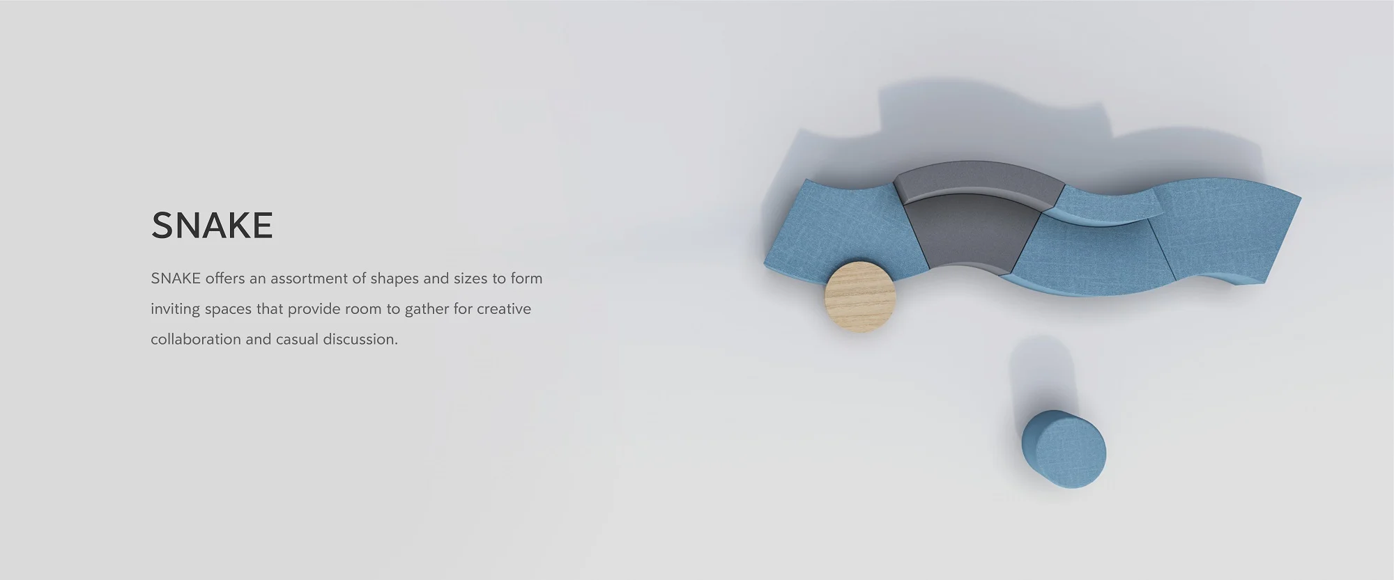 As users seek to renew their energy, SNAKE provides a new range of postures for rejuvenation. Informal and open spaces can lack some of the privacy required for concentration. With partial boundaries, SNAKE can create these focus spaces while keeping the user connected and visible to the environment around them.