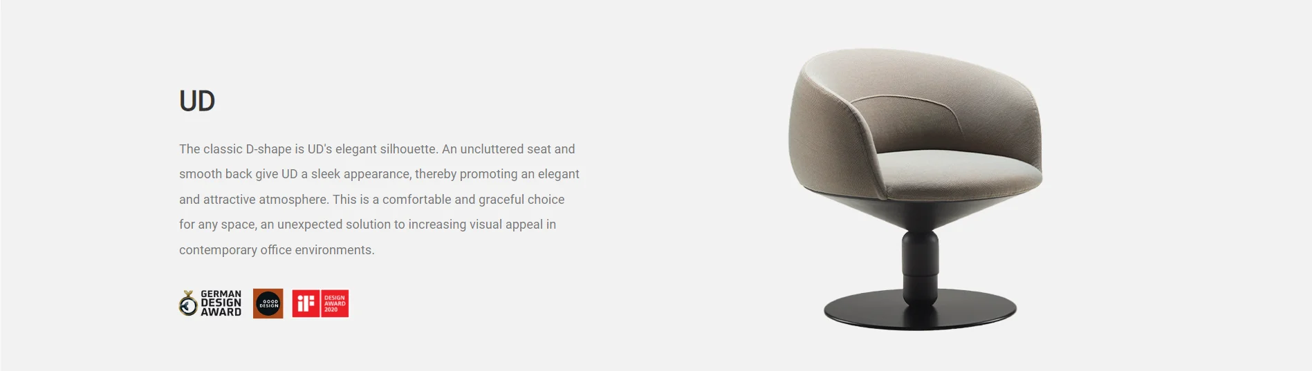 Simple yet elegant, and with a wine glass as its design inspiration, UD exudes a sense of delight and real quality. Its geometrical leg adds unique flair to its surroundings