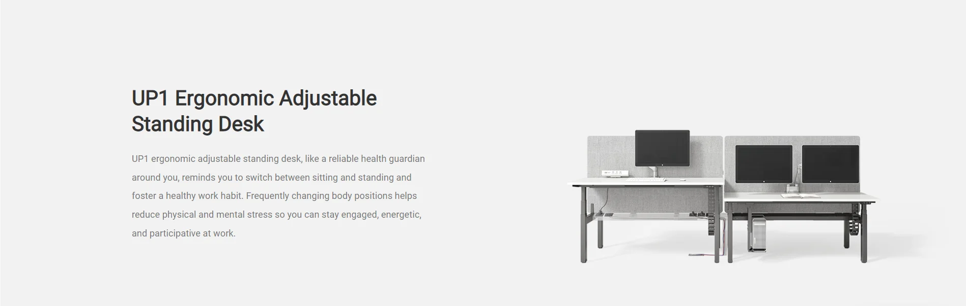 According to surveys, finance/administrative staff suffer most from sedentary working as heads-down work is quite normal because of the nature of their jobs. UP1’s one-set dual-desk system allows two people to sit together. It is also capable of being extended continuously on this basis, catering to the needs of teamwork.