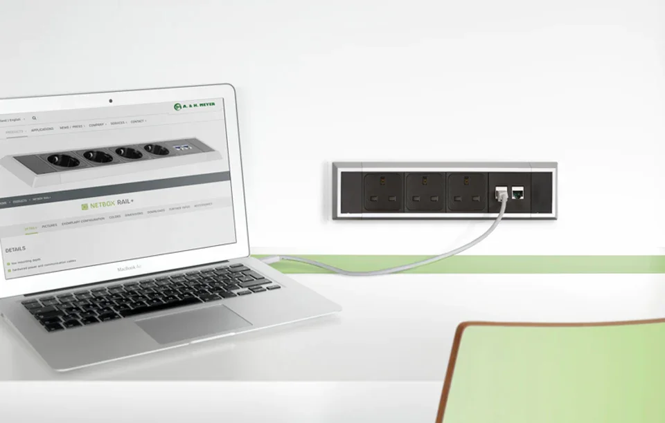 The NETBOX RAIL+ is a new built-in solution for partition walls. The shallow mounting depth is ideal for installation on very thin walls. The NETBOX Rail+ is eminently suitable for shop fittings and exhibition stand construction as its aluminium profile can be readily teamed with up to ten modules.